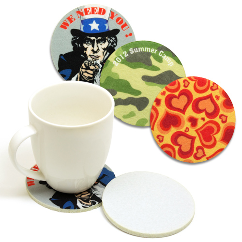 Item Description : Photographic round coasters made of white FELT with your logo/designs sublimated on full surface. CMYK preferred.  Click to Login